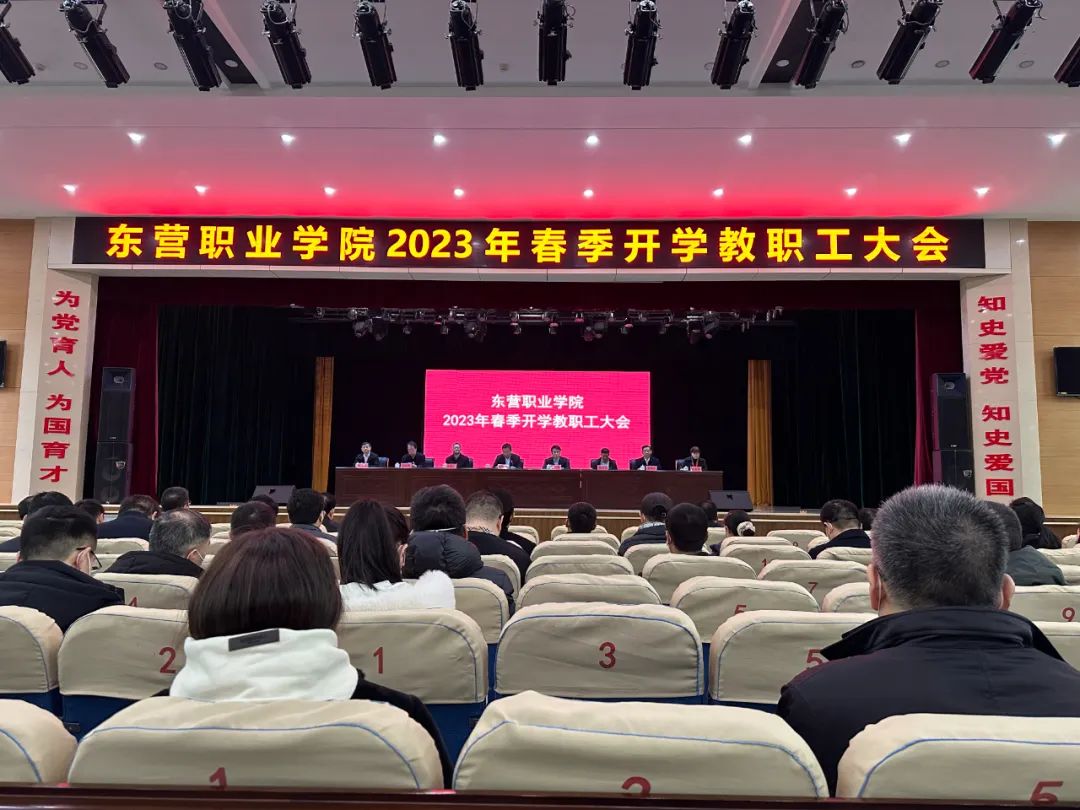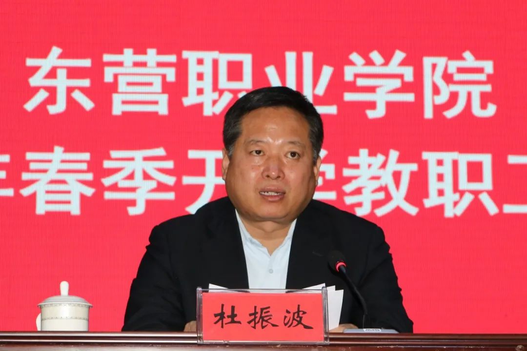 杜振波在讲话中指出,2023年是学校事业发展的又一个里程碑,是第一轮“双高计划”建设收官年、第二轮“双高计划”建设布局年。全体教职工要统一思想,振奋精神,为全力争创本科层次应用技术大学、推进东营职业学院高质量发展而努力奋斗。一是要保持清醒,坚定信心,正确认识我们的学校;二是要认清形势,正视问题,增强发展的紧迫感和责任感;三是要聚焦目标,精准发力,奋力开创各项工作新局面;四是要担当尽责,主动作为,推进各项工作落到实处;五是要不负期待,不负重托,坚决负起光荣职责和使命。