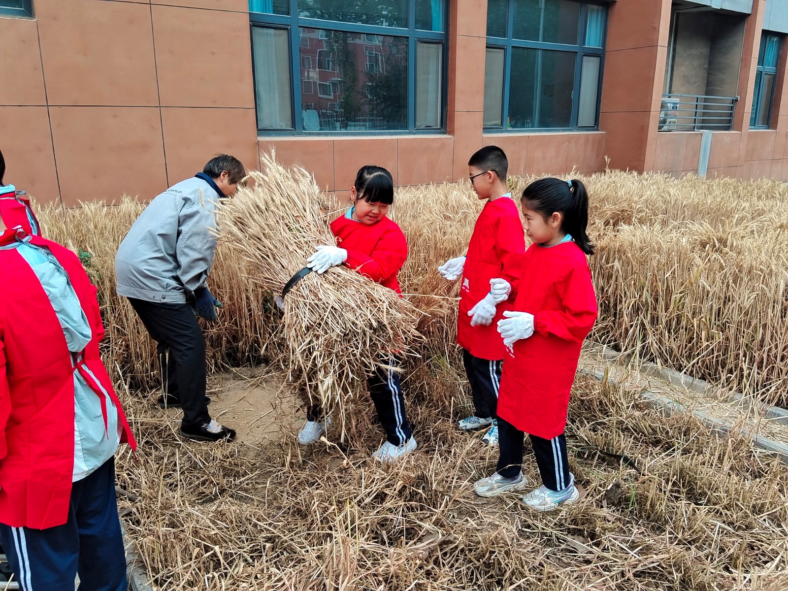 为让孩子们更好体验手工收割麦子,学校邀请有收割经验的爷爷奶奶到校和孩子们一起进行收割。在爷爷奶奶的指导下,孩子们体验收割的过程,一手握着麦秆,一手持着镰刀,斜方向起落,动作一气呵成。看着一捆捆丰收的麦子,汗水在孩子们的脸上也乐开了花。接下来,为了让田间麦穗“颗粒归仓”,同学们分成小组捡拾麦穗,孩子们热情高涨,挥汗如雨……